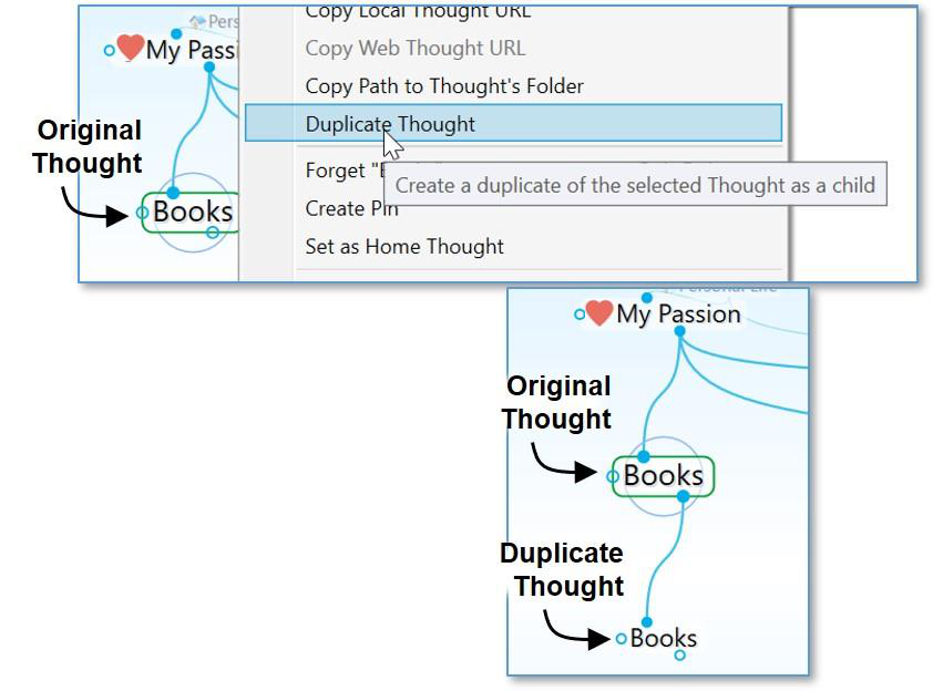 Right-click the thought to be duplicated and then click the Duplicate Thought command on the context menu.