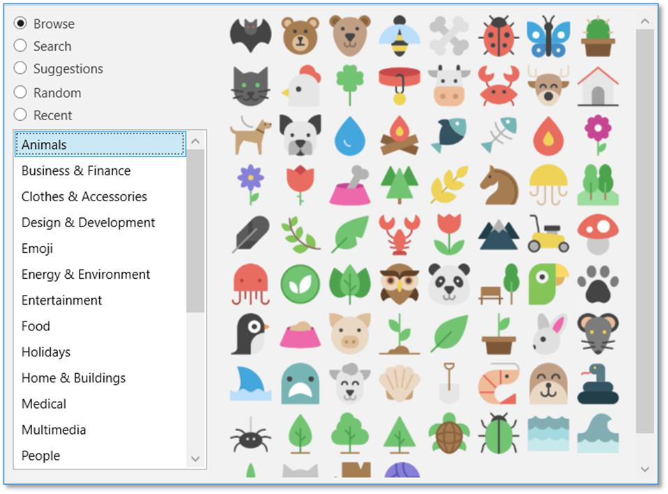 - With the Browse radio button selected, click any of the categories in the left panel. (See the TheBrain Icons section on page 236 for more about icon choices.) Click an icon of your choice to add it to the thought. The Thought Properties dialog box will close automatically when an icon is selected.