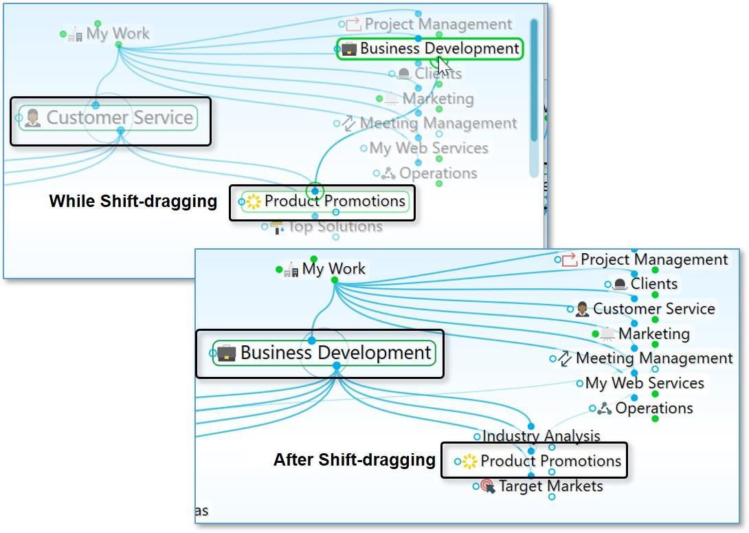 Say that you decide that your “Product Promotions” thought shouldn’t really be a child of your “Customer Service” thought. Instead, it should be the child of “Business Development.” You can quickly change relationships between thoughts in a single step: Hold down the Shift key while linking a thought to a new parent. All of the current parents will be unlinked automatically. Note that even if a thought has more than one parent, all of the former parents will be unlinked.