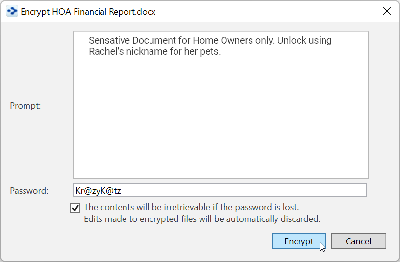 - Type in the prompt you want the user to see when they attempt to open the file, type a password, click the check box confirming that the file cannot be opened if the password is lost, then click the Encrypt button.