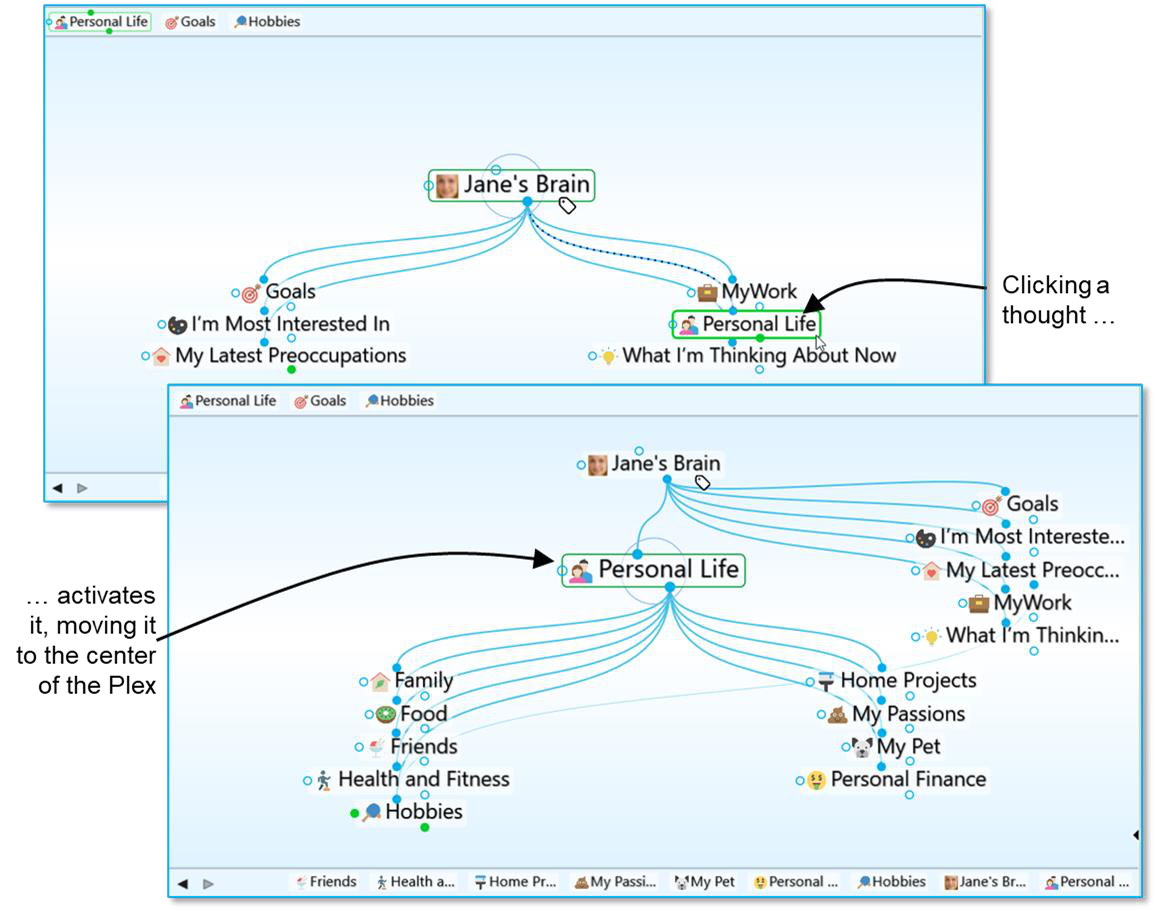 As shown below, when you click a thought, it moves to the center of the plex and