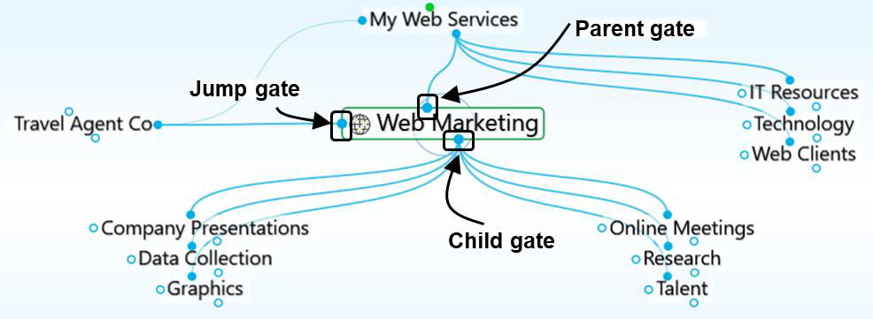 Gate Thoughts in the plex have three circular “gates,” each of which is used to link a specific type of relation: The parent gate is above a thought, the child gate is below it, and the jump gate is to the left or right of it. A gate is hollow when there are no links attached to it and solid when one or more links are attached. Solid gates in a contrasting color have links to thoughts that are not currently showing in the plex.