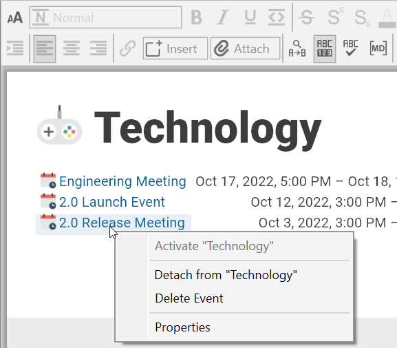 Events created from the content area are automatically associated with the active thought, but you can easily detach them.