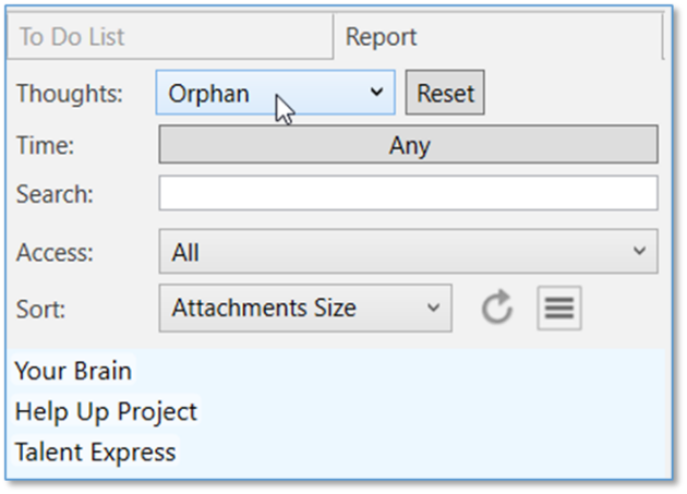 Select Orphan in the Thoughts drop-down to quickly view and access any thoughts that do not have any other connections.