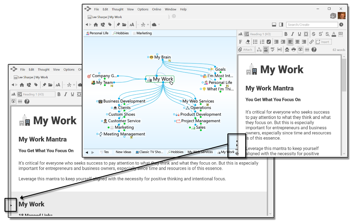 menu. Then, maximize the plex in one window and the content area in the other. Changes you make in one window will be reflected in the other because you’re working with the same brain, however, the windows won’t be in synch. In other words, making a thought active in one window won’t make it active in the other.