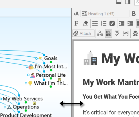 Notes in TheBrain are created using a next-generation markdown editor. This improved version of markdown enables more capabilities than standard editors for a superior editing experience. As mentioned, the visibility of markdown tags can be turned on/off with the Show Markdown button in the content area toolbar.