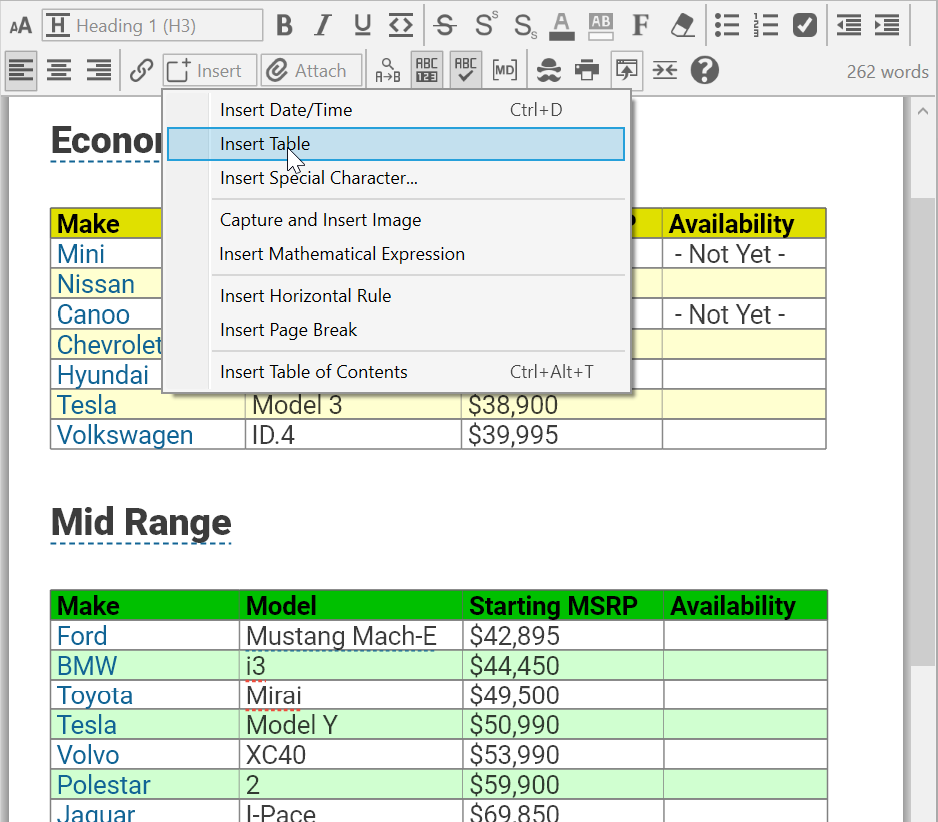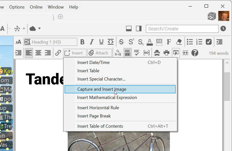 Insert: Date/Time, Table, Special Character, Capture and Insert Image, Mathematical Expression, Horizontal Rule, Page Break and Table of Contents
