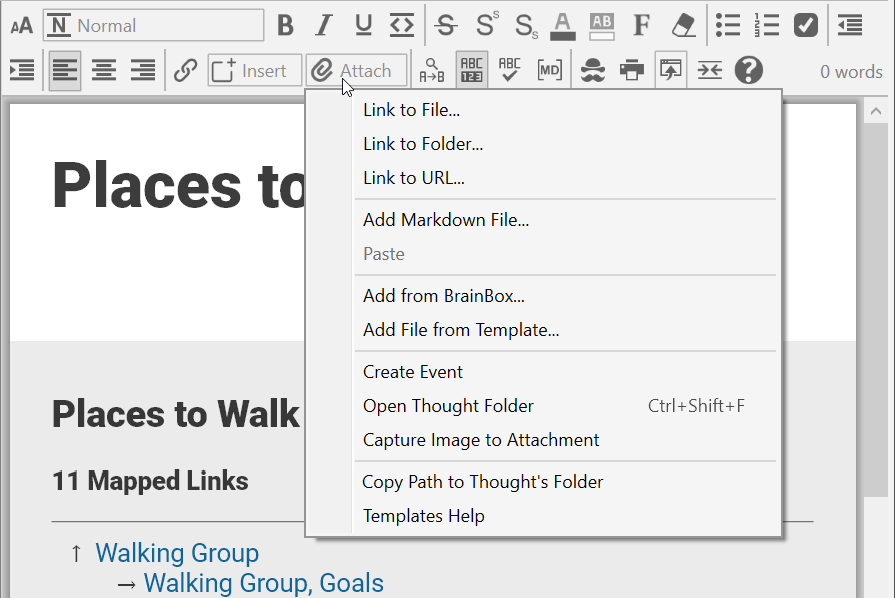 Attach: Link to File/Folder/URL, Add Markdown File, Paste, Add from Brainbox, Add File from Template, Create Event, Open Thought Folder, Capture Image to Attachment, Copy Path to Thought’s Folder, Template Help