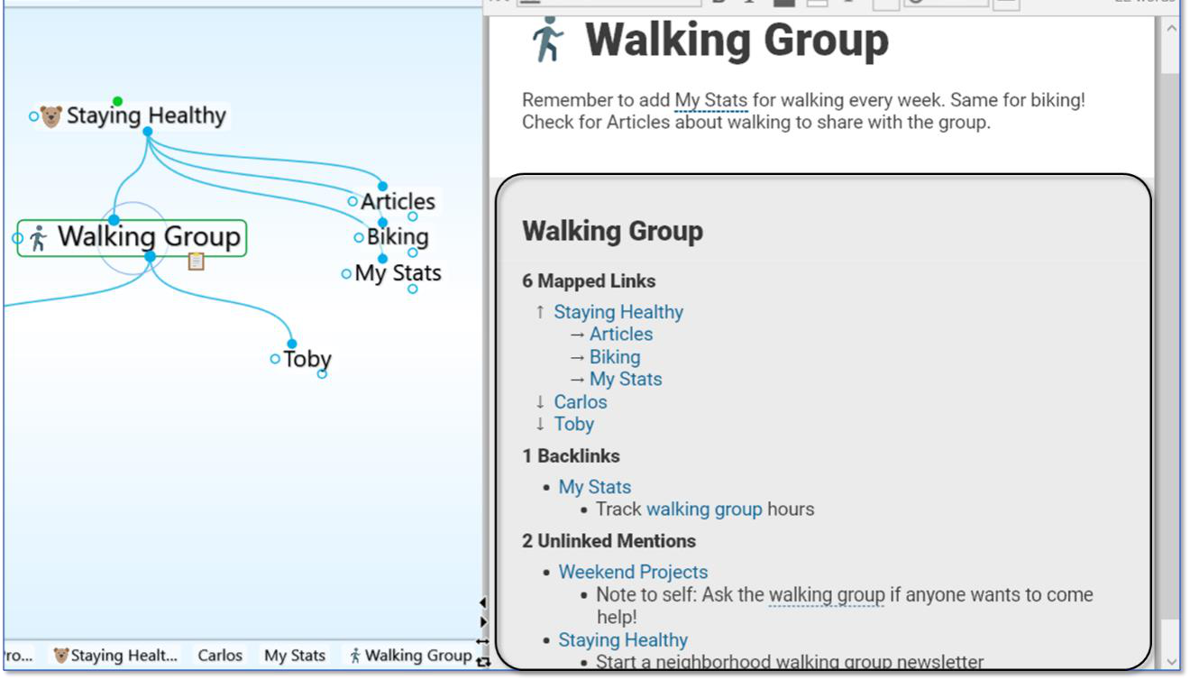 While mapped links refer to thought names, backlinks and mentions display both the names of the related thoughts and the context of the notes in which they appear.