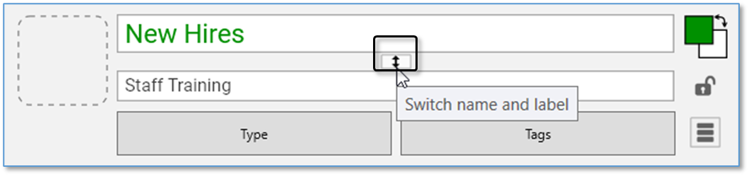You can swap a thoughtâs name with its label by clicking the Switch button (double sided arrow) in the ThoughtProperties dialog box. This can be very useful when the default label and name are assigned based on a URL and the automatic naming isnât optimal for your purposes.