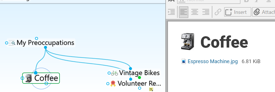 In any thought, you can attach an icon from TheBrainâs built-in selection, an image from a file of your own, an image from notes or attachments in the active thought, or a screen capture. These pictures provide a visual boost to your brain. When you point to the icon next to the thought, the picture zooms to a larger size automatically.