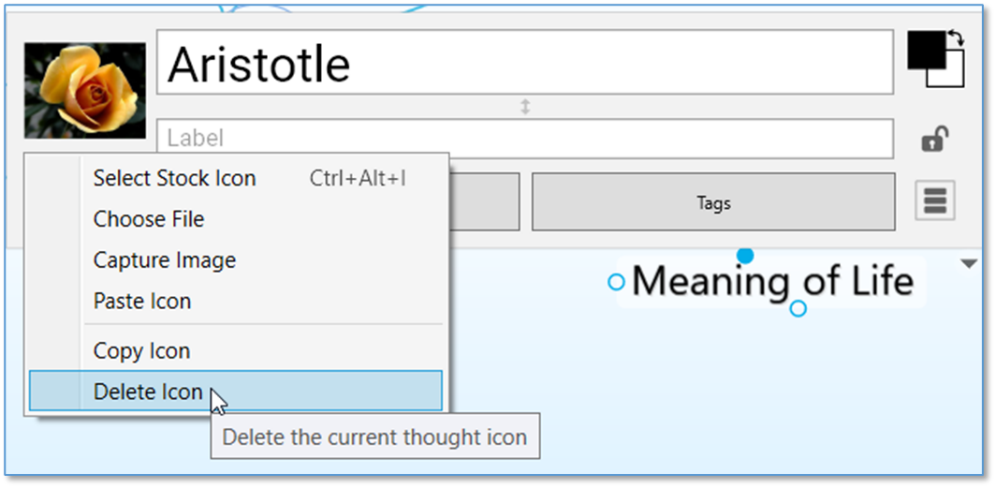 After the image is copied, from the Thought Properties dialog box, click the thought icon box or right-click on a thought in the plex and select the Paste Icon command.