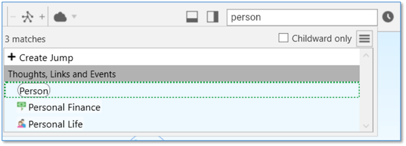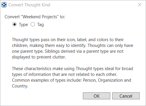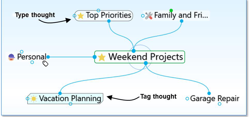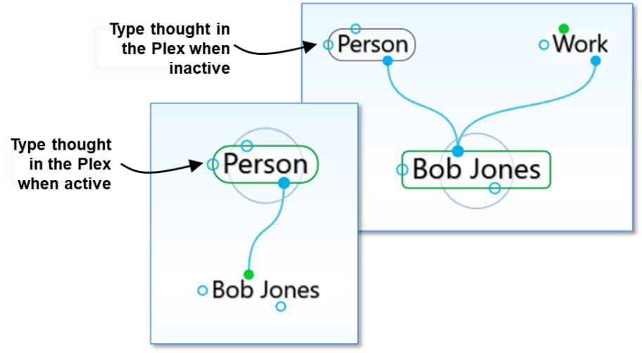 Types and tags can be visible in the plex. Want to see a type or tag as a child thought? Just link any existing type or tag thought as a child, or as a jump. Optionally, types are visible as parent thoughts as well.