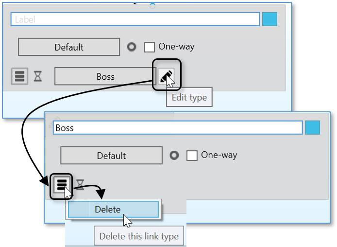 Open the Link Properties dialog box for the link that has the Type you want to delete, then click the Edit button to open the Type Properties box.