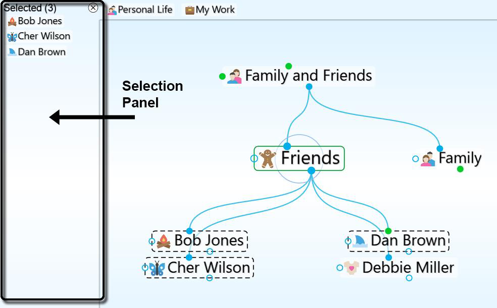 Selected thoughts are then added to TheBrain’s Selection panel for making mass edits on large groups of thoughts at one time.