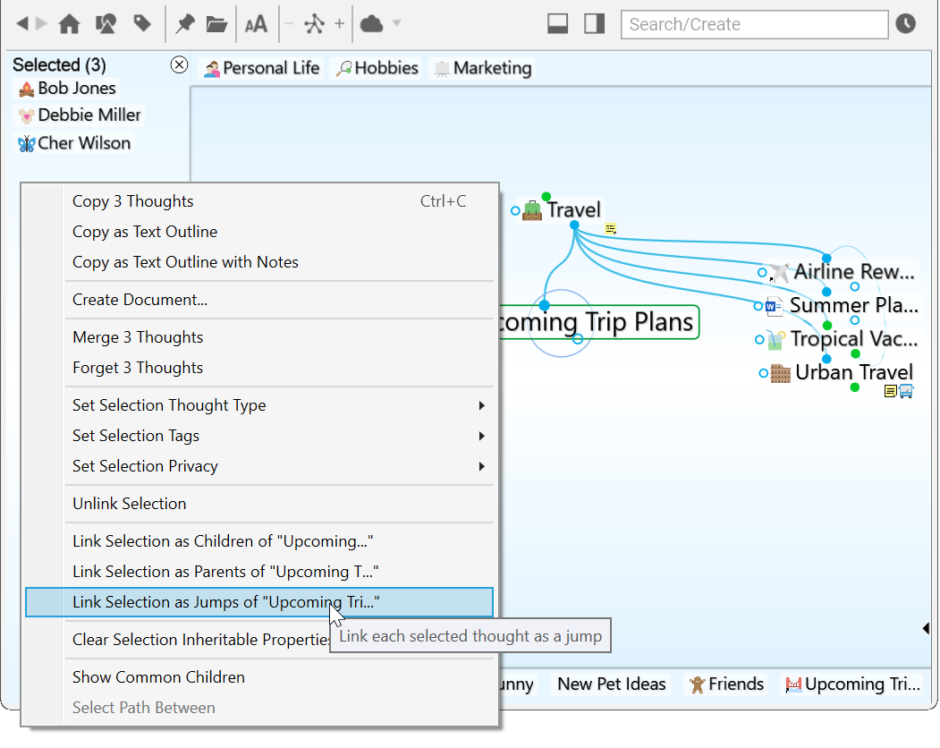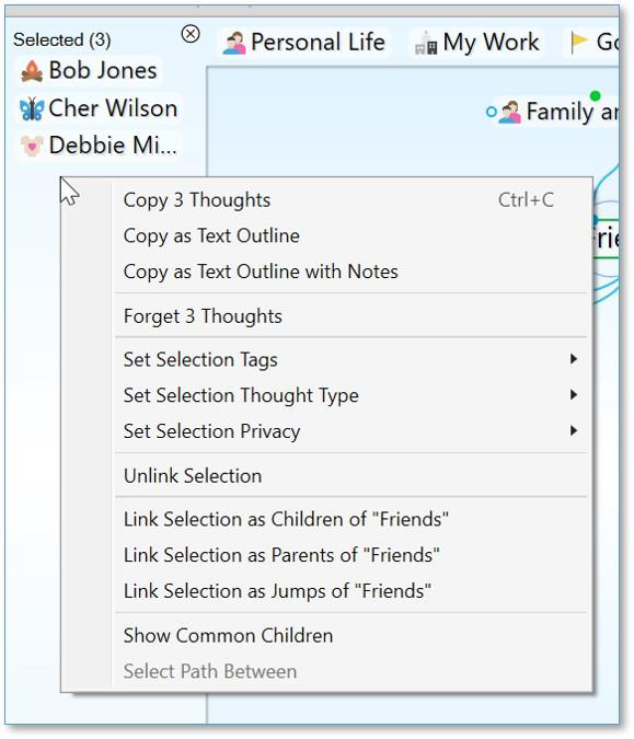 Thoughts in the Selection panel can be linked to the active thought using the Selection menu: