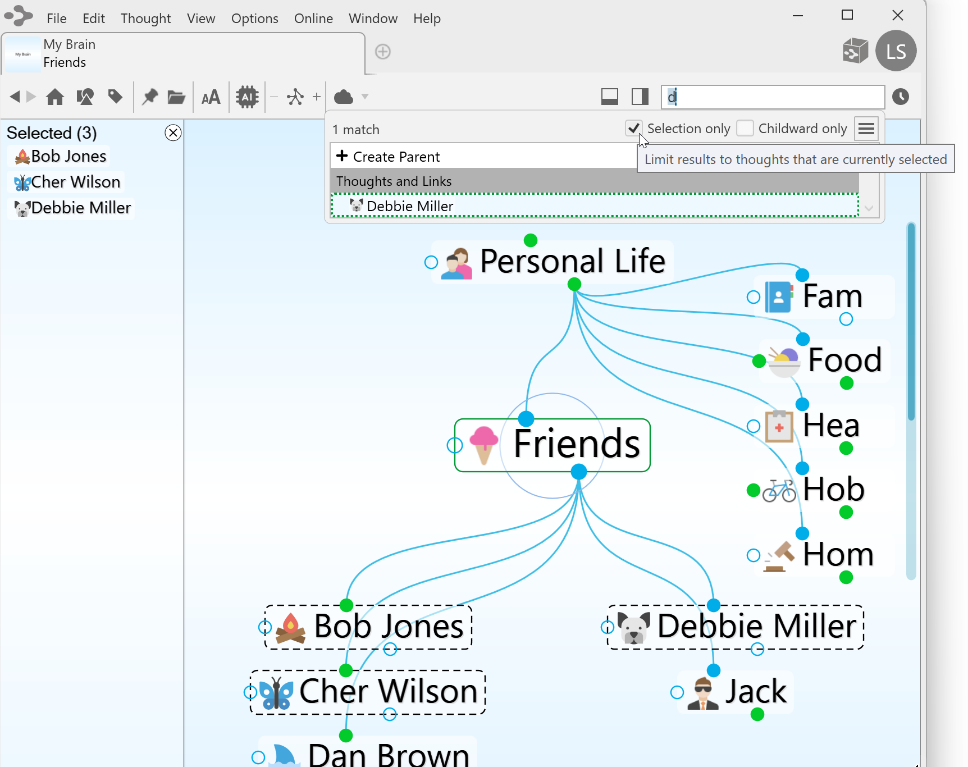 Once you have created a selection, you can also use it for other things besides what you see in the menu. For example, you can limit searches to selected thoughts. In the example below, only “Debbie Miller” is found because it is the only thought name beginning with “D” that is currently selected.