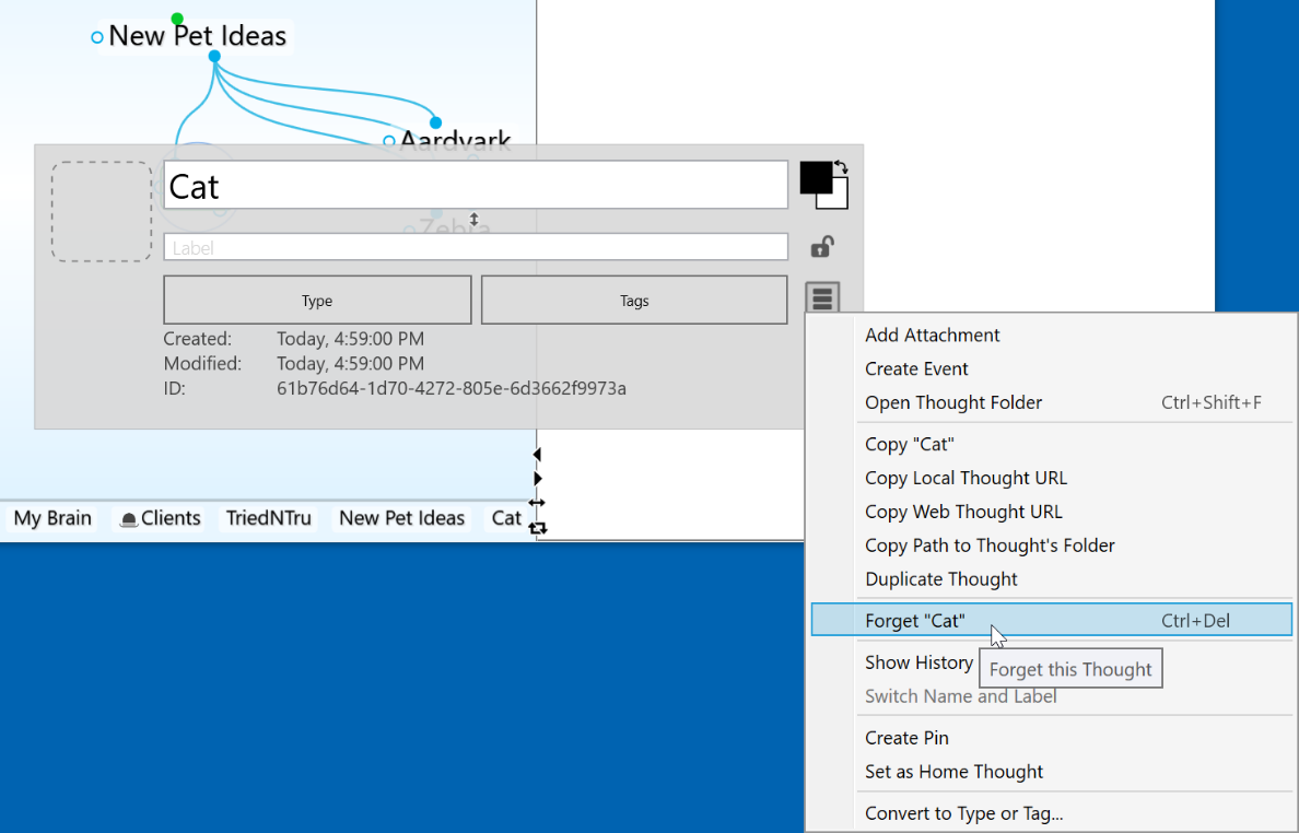 Right-click the thought to be forgotten, then click Forget Thought Name in the context menu, or
