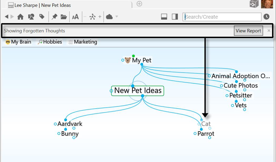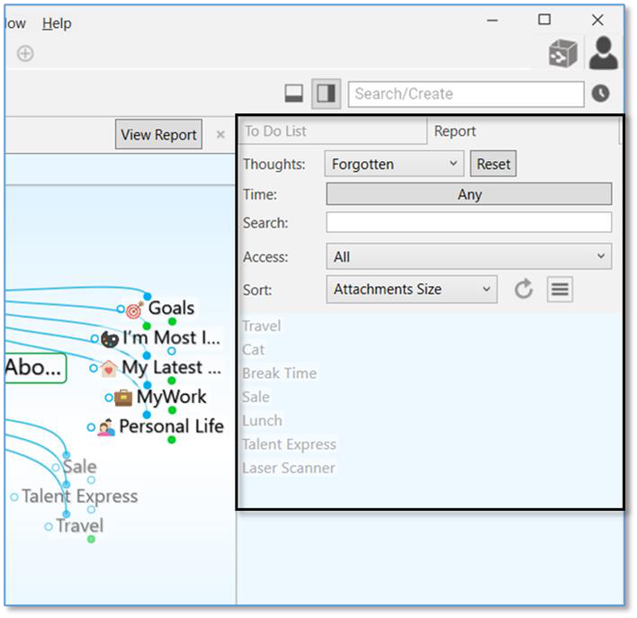 - Notice the “Showing Forgotten Thoughts” message above the pins. This reminds you why some thoughts are grayed. You can use forgotten thoughts just like normal thoughts as long as they are displayed. Click the View Report button to work directly with the forgotten thoughts.