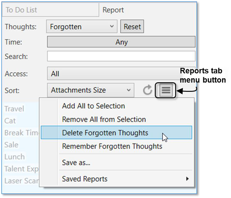 - Click the Reports tab menu button, then select Forgotten from the Thoughts drop down menu. You can then click on the context menu button and select Delete Forgotten Thoughts. Alternatively, you can use the Ctrl key (Cmd on macOS) to select multiple individual forgotten thoughts and then delete only those.