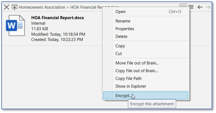 You can encrypt individual file attachments within your brain using the Encrypt command on an attachment’s context menu.