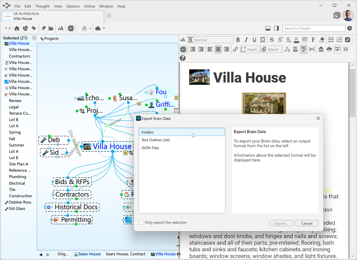 To export just a portion of your brain, add thoughts first into TheBrain’s Selection panel and then check the option to Only export the selection in the Export window.
