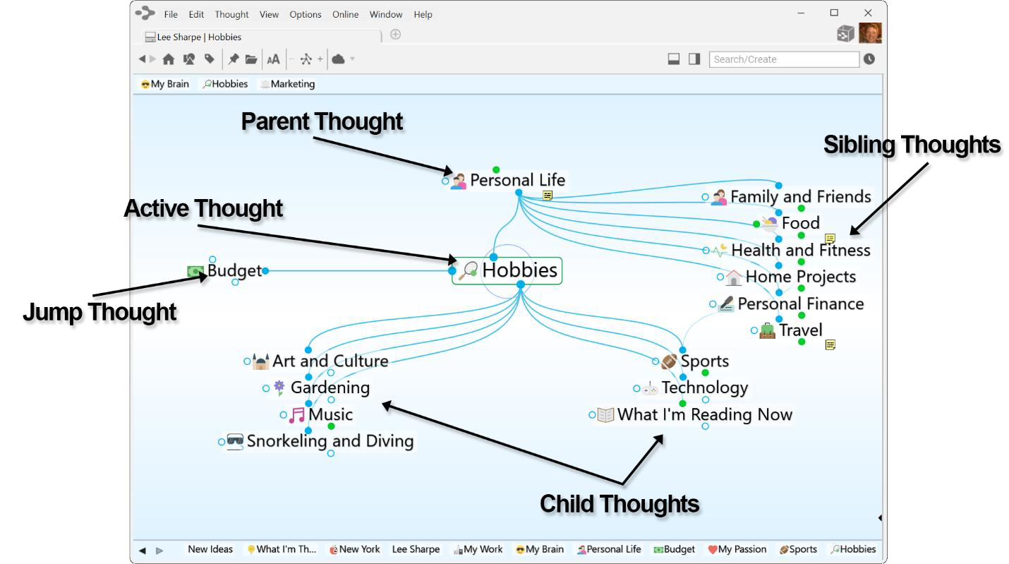 Jump thoughts are related to the active thought but are neither child nor parent topics. They appear in the jump zone to the left of the active thought. Jump thoughts have an âequal weightâ relationship with the thought to which they are related. For example, as shown above, âHobbiesâ has the various hobbies âArt and Culture,â âGardening,â âMusic,â âSnorkeling and Diving,â âSports,â âTechnology,â and âWhat Iâm Reading Nowâ linked as child thoughts since they are types of hobbies. âBudgetâ affects the amount of resources available to spend on the various hobbies and so it is closely related, but it is not a hobby itself. Therefore, it makes a perfect jump thoughtârelated, but not part of the main thought grouping.