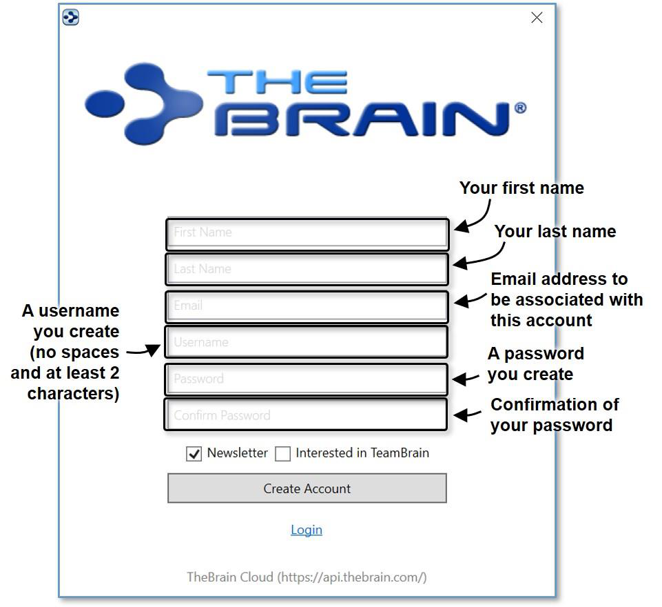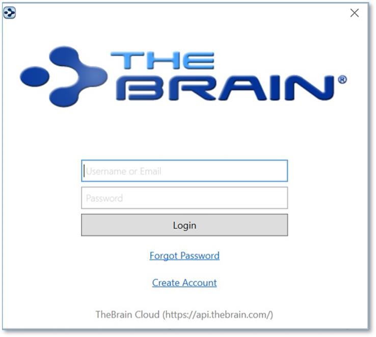 The first time you download and install TheBrain, youâll be prompted to log in or create an account if you donât already have one. The log-in window provides the ability to create a new account or log in to an existing account.