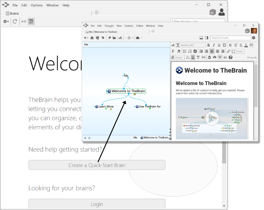 You may want to attend one of TheBrain's free online seminars on getting startedâTheBrain 101. To learn more about TheBrain 101, go to https://www.thebrain.com/support/thebrain-101.