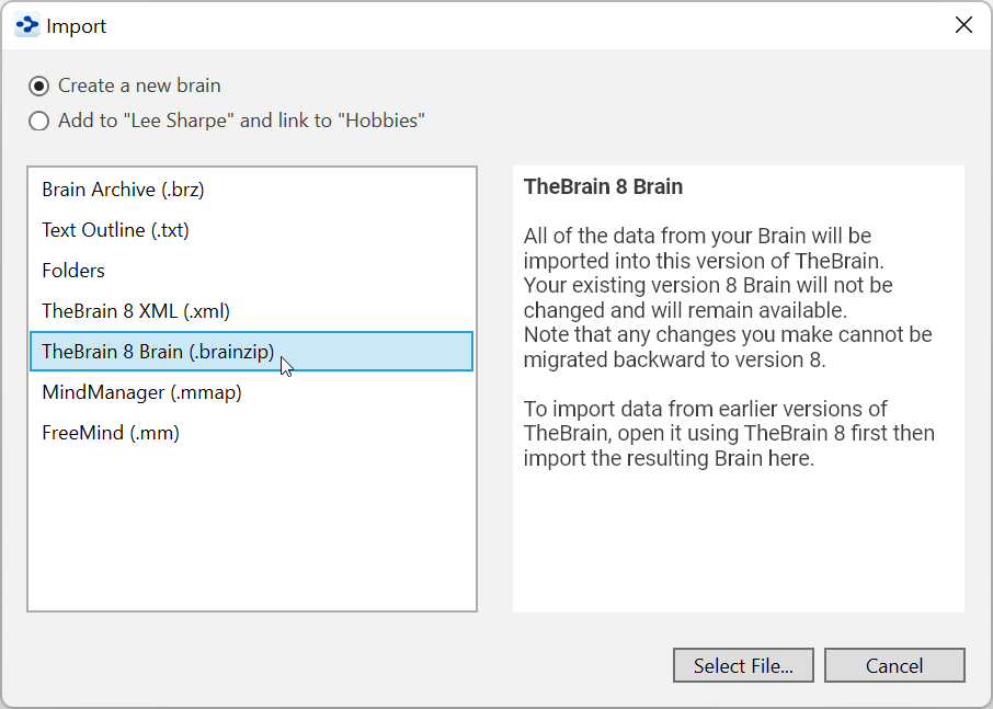 To open a .brn file that you created in a version older than TheBrain 8, first open it using TheBrain 8 and then import the resulting brain in TheBrain 13, as described in the steps below.