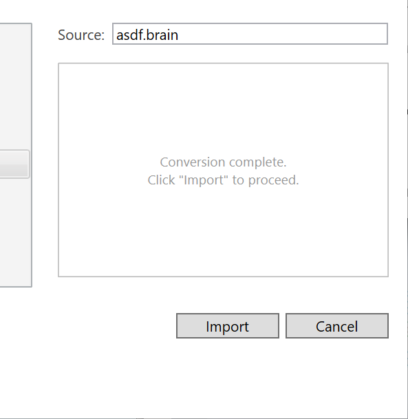 When TheBrain has finished converting, you will see a âConversion completeâ message as shown below. Click the Import button.