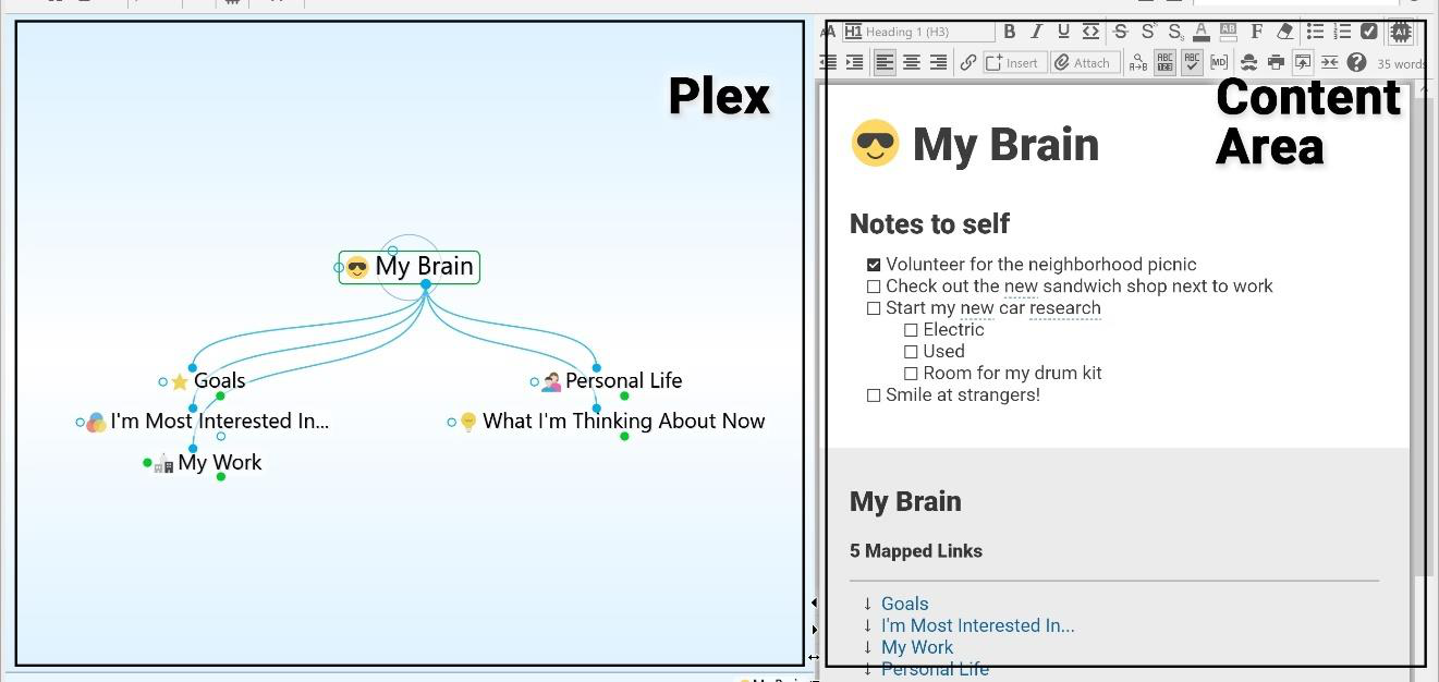 Clicking any thought or link in the plex displays its associated content in the content area.