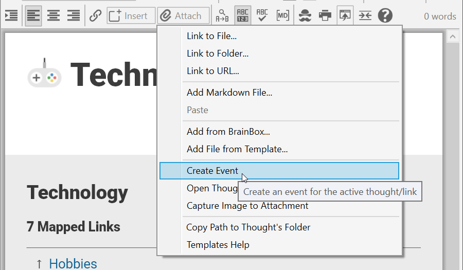 Events created from the content area are automatically associated with the active thought, but you can easily detach them.
