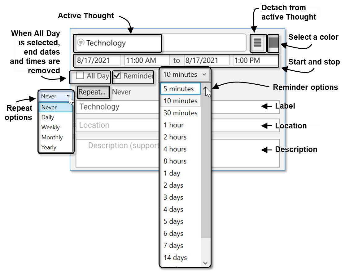 Use the event editor pop-up to enter details about the event. By default, the name of the event is the name of the active thought.