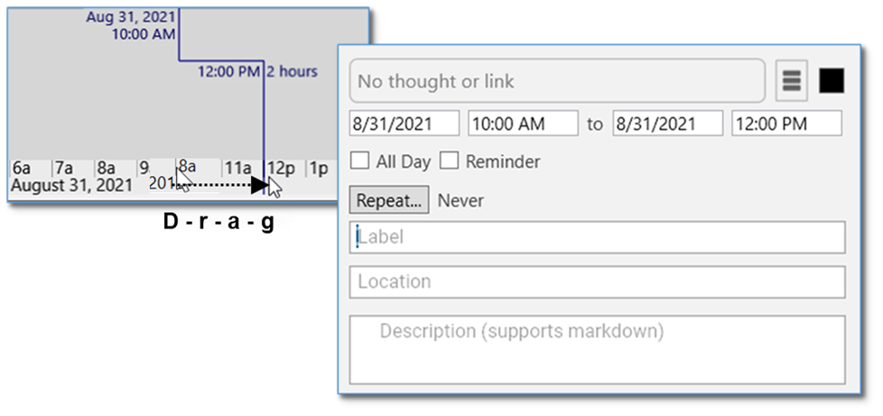 - Drag on the time ruler at the bottom to select the start and stop times of the event. After you finish dragging, the event editor will be displayed. By default, this will be a standalone event, not associated with the current active thought. You can easily attach it to the active thought by clicking Attach to “active thought” in the event editor menu.