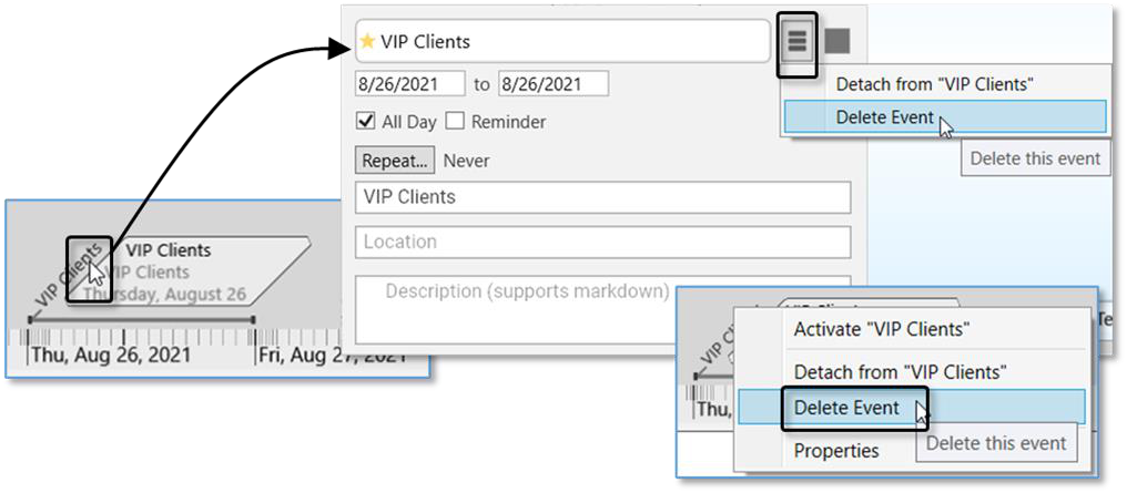 To delete, right-click the event on the Timeline, then click Delete Event. You can also delete the event by selecting Delete Event in the event editor pop- up.