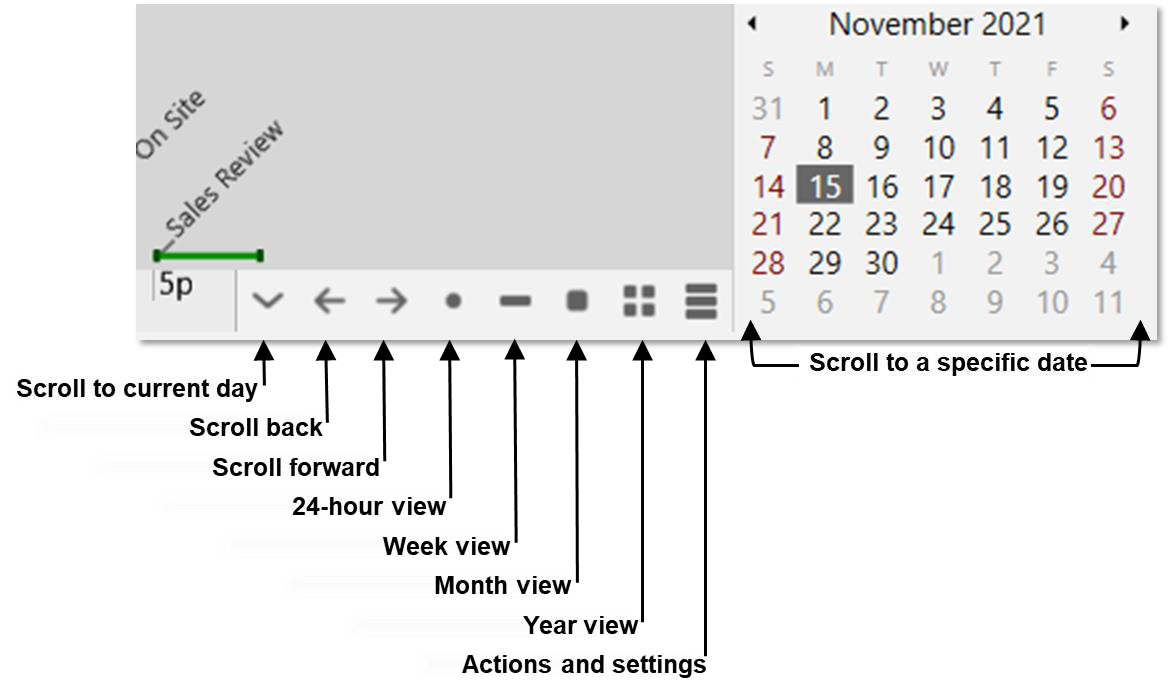 - Buttons allow you to switch between day, week, month and year view. Or, navigate to a specific day in the mini calendar.