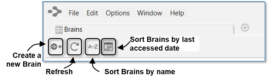By default, brains are listed according to how recently they have been accessed. You can also see the list of brains sorted alphabetically using the Brains tab toolbar, shown below. All brains that are locally available are shown first, followed by brains that are available online.