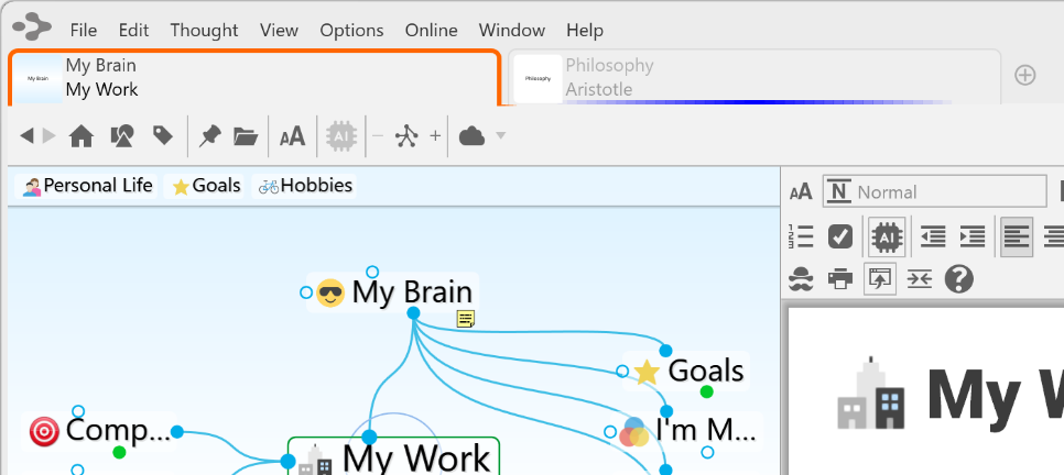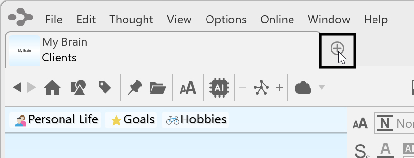 Open the same brain in multiple tabs to view and edit multiple areas at a time. This lets you view different areas of your brain at the same time, and, if you like, use a different layout in each tab. Note that tabs are simply views into the same brain data and changes made in one tab affect all other tabs of that brain.