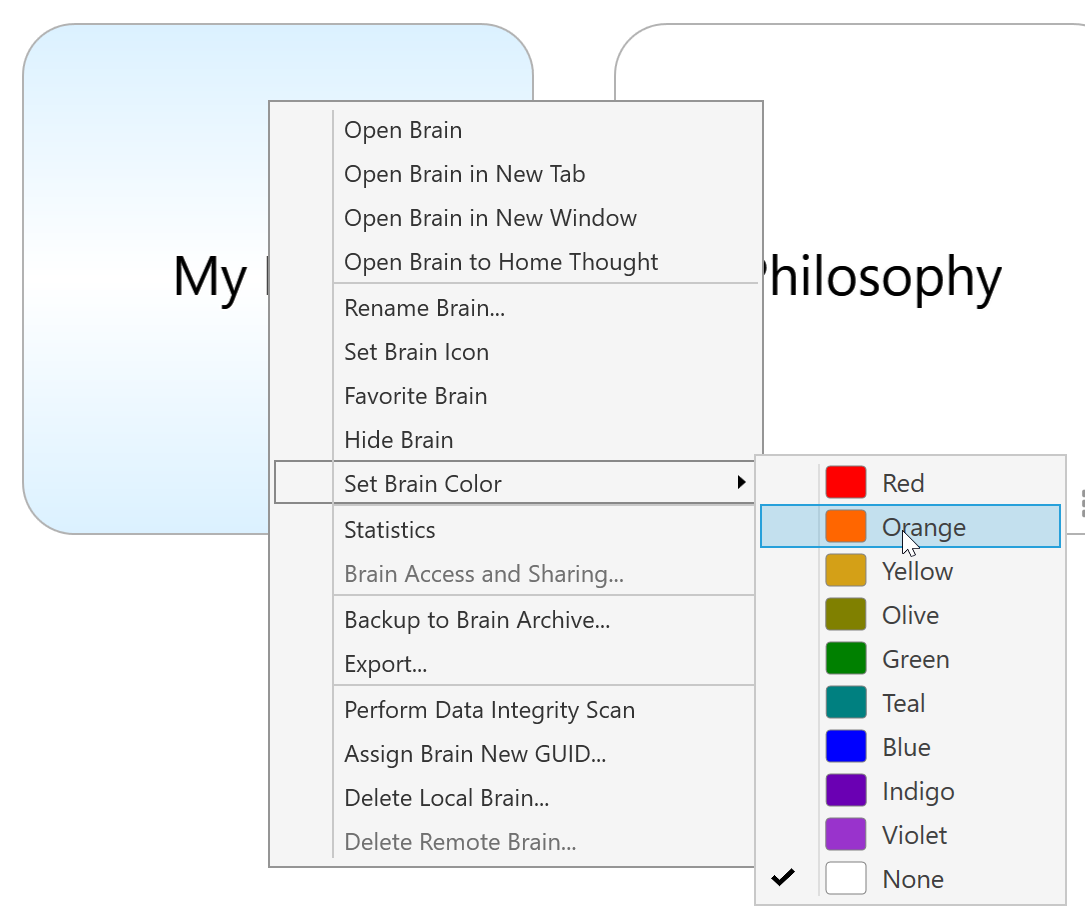 To permanently set a tab color for a specific brain, right click on a brain thumbnail in the brains list and select Set Brain Color. The color selected will appear in the
