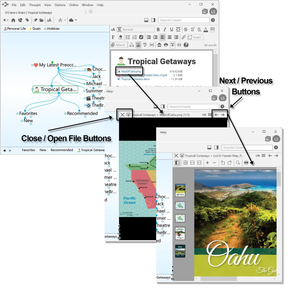 Certain types of file attachments are automatically previewed inside of TheBrain. These include web pages, images, text, markdown files, JSON, .html files and PDFs. Simply click on an attachment’s tab and its preview will be shown. In the example below, Tropical Getaways is the active thought and there are two attachments in the content area—an image and a PDF.