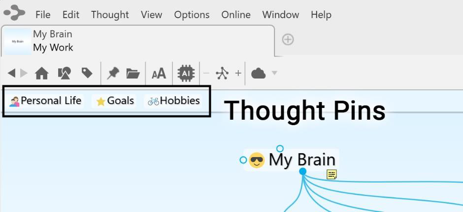 Pins are shortcuts to thoughts to which you want quick access. They appear at the top of the plex, just below TheBrain toolbar. No matter where you are in your brain, the pins remain visible.
