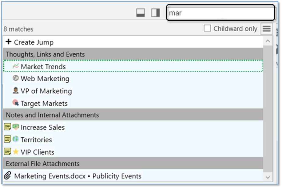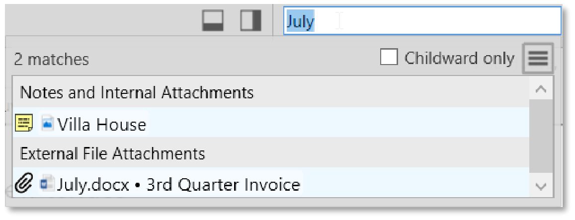 Figure 44. Search Results for Both Internal and External Attachments - Below the search box is an option for searching Childward only. Selecting this option will limit the search results to 3 generations below the current active thought.