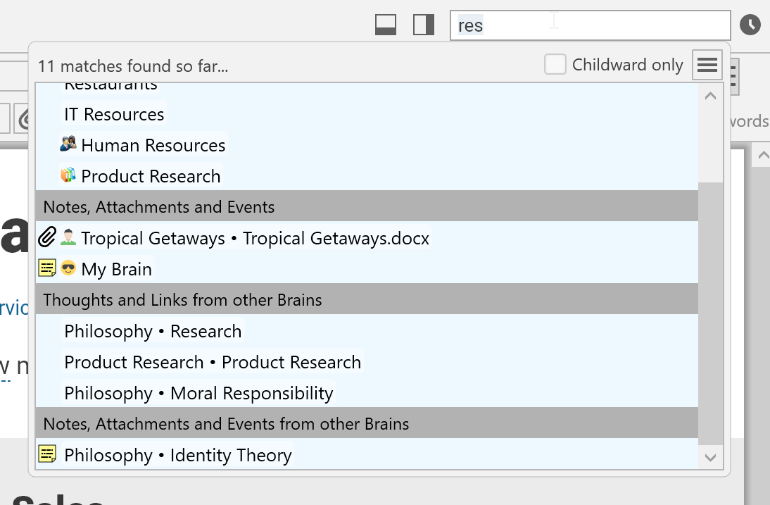 however, you’ll also see results of your search query in Thoughts and Links from other Brains and Notes, Attachments and Events from other Brains. To keep the search process efficient, search results will be displayed progressively - first from your current, open brain and then from other brains.