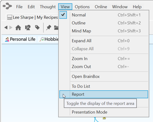To open a brain's Report area, click the View menu then click the Report command. You may also click on the Right Panel button next to the search box. The report pane is resizable.