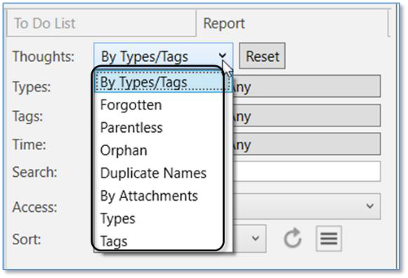 The Thoughts drop-down list includes the following options and each selection provides additional criteria choices for fine-tuning your reports.