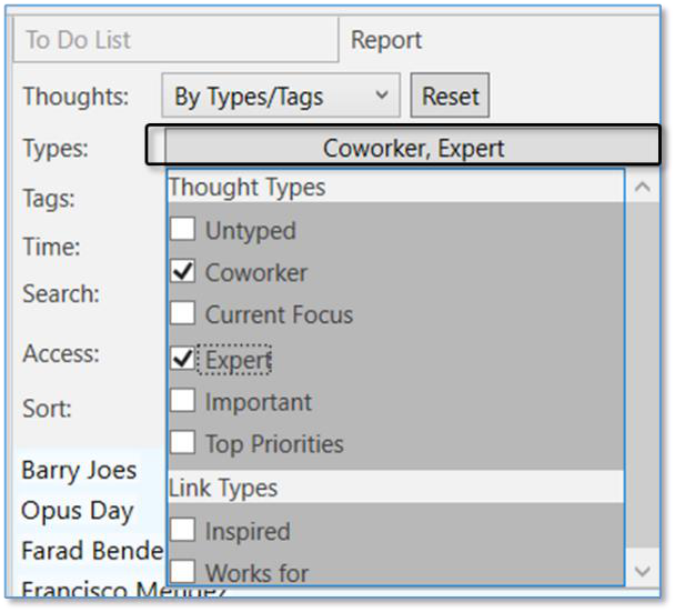 - Click the field to the right of Types (which will display “Any” if no Types have been selected yet), then select the check box for each thought Type to be included. Click outside of the list to close it.