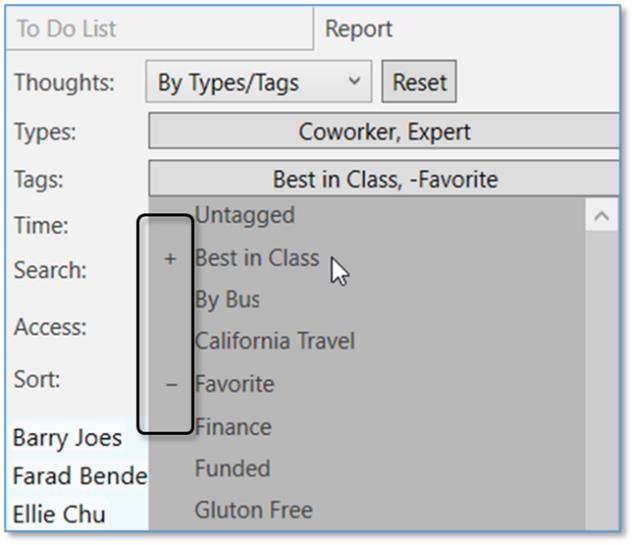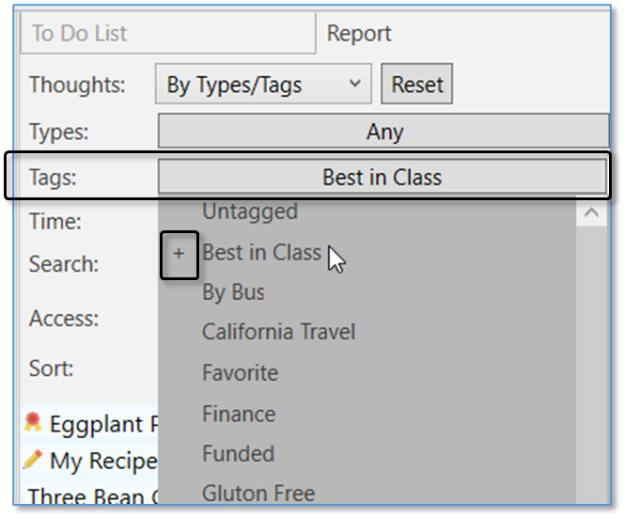 Clicking on a Tag in the list will add a “+” next to it, indicating that you want to list thoughts that have that Tag. Clicking the same Tag again will add a “-“ next to it.