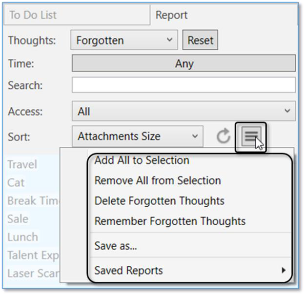 With Forgotten selected in the Thoughts drop-down, you can use the menu button to add all forgotten thoughts in your report to your Selection, remove all forgotten thoughts in your report from your Selection, permanently delete all forgotten thoughts in your report, or remember all forgotten thoughts in your report.