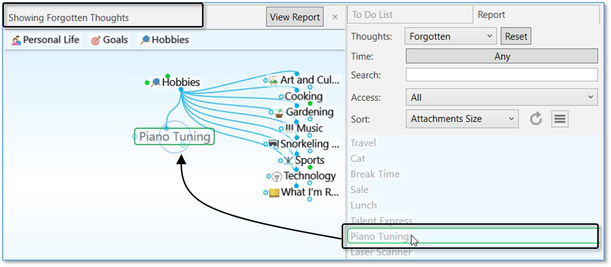As soon as you click any forgotten thought in the list, a “Showing Forgotten thoughts” message will display above the plex. Click any forgotten thought in the report to display that thought in the plex.